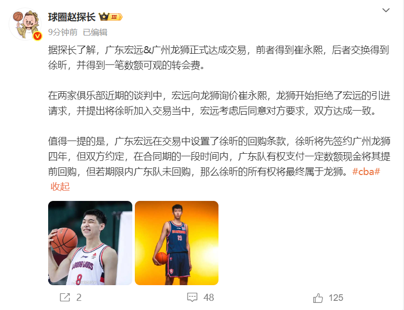 北京时间8月29日,根据媒体人球圈赵探长的报道,广东男篮与广州男篮的交易正式达成,广东收获崔永熙,广州得到徐昕+一笔数额可观的转会费。