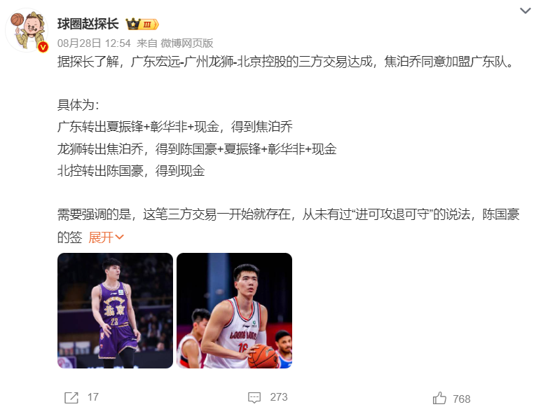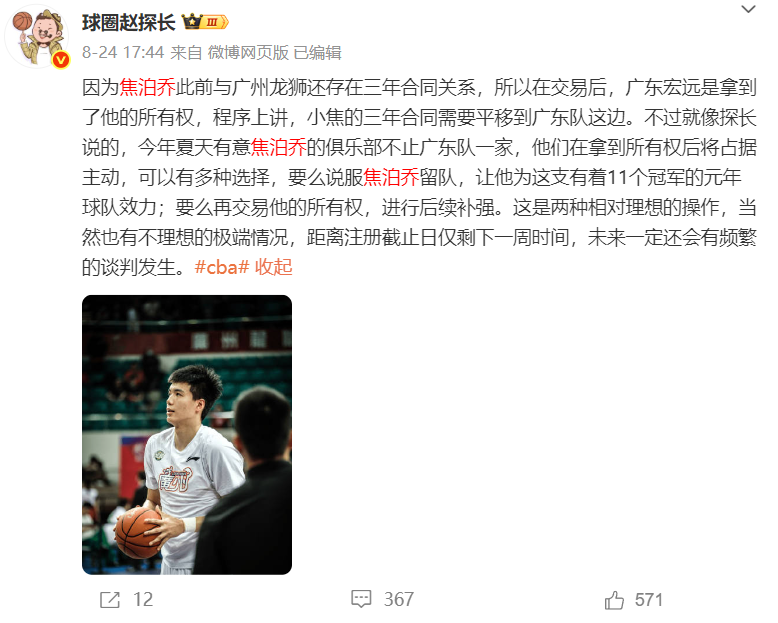 一天之前赵探长爆料是说广州、广东、北控三方交易,焦泊乔同意加盟广东。